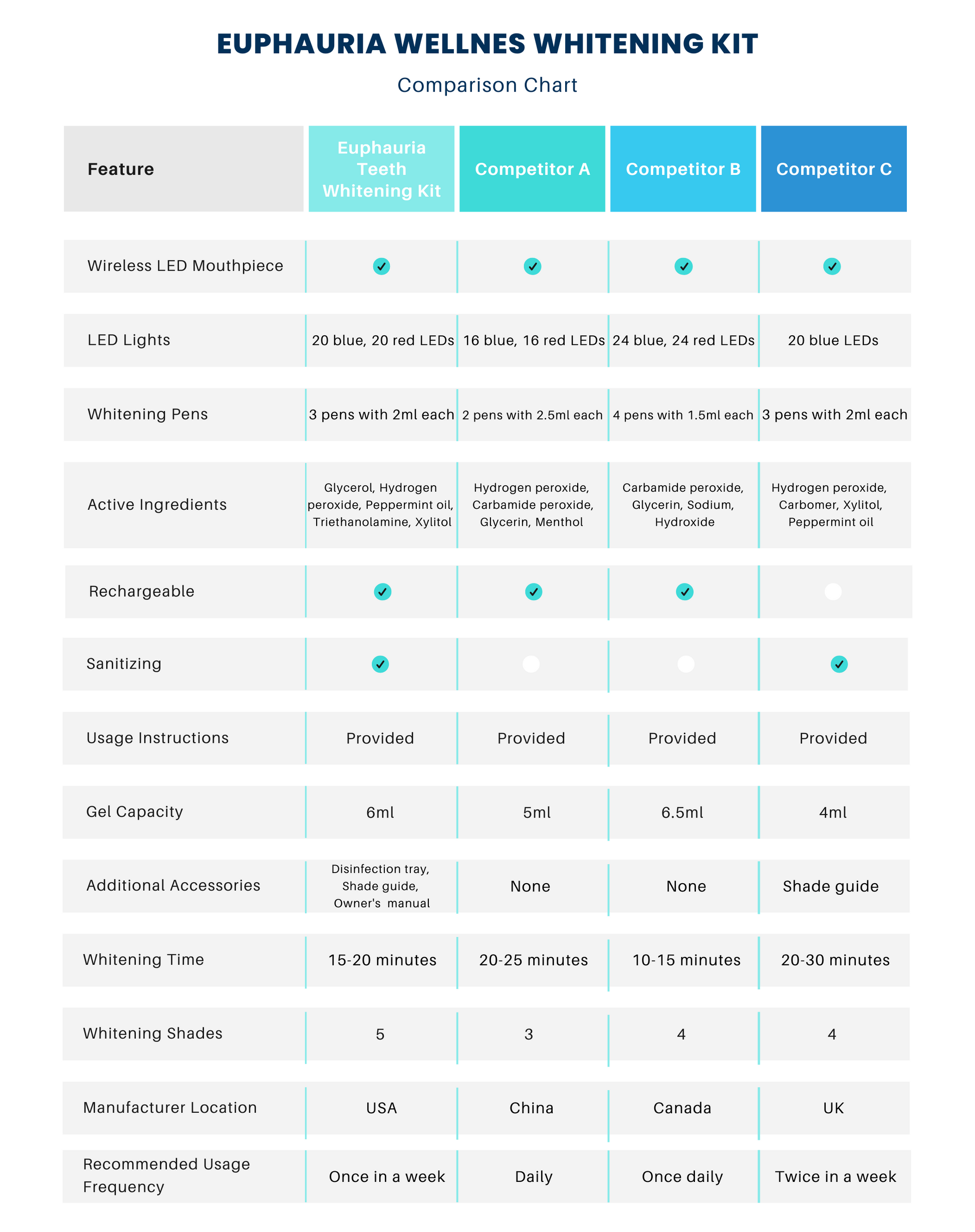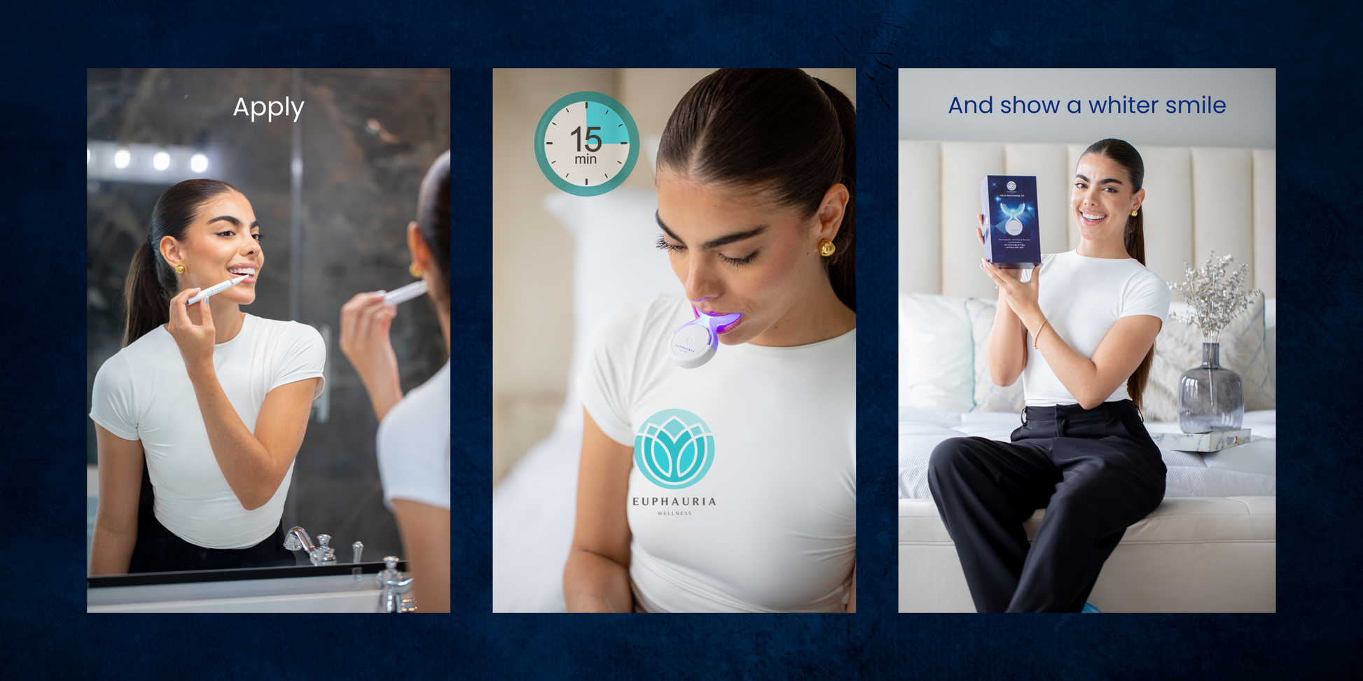 Achieve a radiant, professional-grade smile with the <strong>Euphauria Wellness Teeth Whitening Pen. This 4ml (0.14fl oz)</strong> pen is packed with a potent whitening gel formulated with high-quality ingredients like Propylene Glycol, Glycerol, and Hydrogen Peroxide. Designed to provide superior whitening results without the need for expensive dental treatments, it brings salon-level care right into your home.</li><li>The Euphauria Wellness Teeth Whitening Pen features a user-friendly twist dial mechanism for easy application. Simply twist the dial to release a precise amount of gel onto the brush tip, then apply it in a circular motion to your teeth for even coverage. Our gentle formula is crafted to minimize discomfort, making it suitable for sensitive teeth while ensuring effective whitening results.</li><li>Perfect for busy lifestyles, this compact and travel-friendly pen fits seamlessly into your purse or pocket, allowing you to maintain your whitening routine on the go. For best results, follow our seven-step process: brush your teeth, apply the gel, and avoid eating or drinking for 30 minutes. With consistent use over seven days, you'll notice visible improvements in your smile’s brightness, helping you achieve the dazzling results you desire.